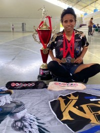 Karolina ao lado dos troféus conquistados pela equipe. Imagem: Divulgação.